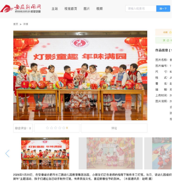 关注新春将至,合肥市长江路幼儿园教育集团总园在“巧手做灯笼,欢乐迎新年”主题活动中,记录师幼制作灯笼、创意纷呈场景的多张精彩照片,相继亮相中国教育报、光明日报、人民网、中国教育新闻网、安徽新闻网、安徽日报、合肥晚报巢湖晨刊等主流媒体平台,生动呈现了幼儿园将传统文化融入日常教育的丰硕成果,收获了广泛的社会关注与好评。