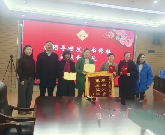 随后,副校长吴燕青、张红兵为辛勤付出的带教老师颁发荣誉证书与锦旗,感谢他们以专业与爱心护航家庭成长。家长代表也向学校赠送锦旗,表达对学校搭建学习平台、赋能家庭教育的诚挚谢意,并与校领导合影留念,画面温馨感人。