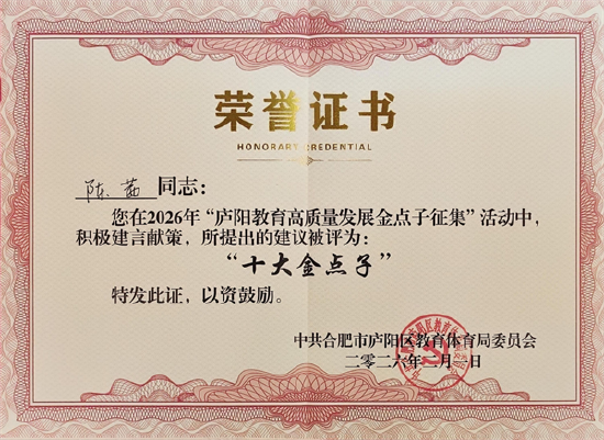 喜报!陈茜副园长荣获2026年庐阳教育高质量发展“十大金点子”殊荣