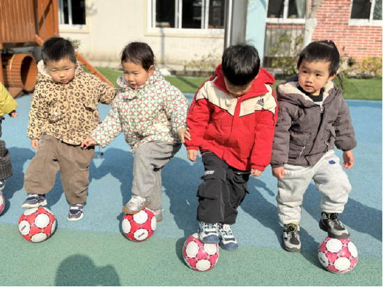 活动中,孩子们化身“小小足球手”,每人抱着足球整装待发。随着老师举起绿灯牌,宝贝们用小脚轻轻推球前进,小脸上满是专注;红灯亮起时,迅速用脚掌踩停足球,动作萌态十足。老师不时用趣味提问引导:“小球怎么才能乖乖停下呀?”孩子们在反复尝试中掌握控球技巧,操场上传来阵阵欢笑声。