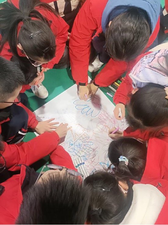 作为心理团辅的收官环节,“请与我击掌”活动温馨而富有仪式感。同学们共同完成一幅承载全班期许的集体画作,并围坐合影。相互叠加的手掌印象征心意相连,也为本次活动留下了温暖而深刻的集体印记。