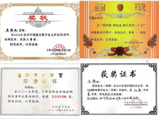 荣誉背后,是她对师德最朴实的践行。在孩子们心中,她是温柔耐心的守护者;在同事眼中,她是乐于分享、携手共进的伙伴。二十余载幼教路,她始终将爱与责任融入每一个教育细节,用艺术的雨露浇灌童心,用无私的陪伴守护成长。