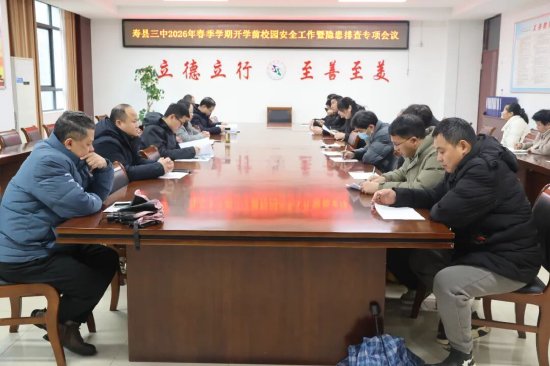 为切实保障春学期开学平稳有序,坚决守住校园安全底线,3月1日上午,寿县三中召开2026年春学期开学前校园安全工作暨隐患排查专题会,对校园安全隐患排查、重点领域防控、日常管理规范等工作进行全面部署。校长杨高虹,校安办全体成员,各功能室和活动中心负责人,物业和安保负责人,安全员、实验员等参加了会议。