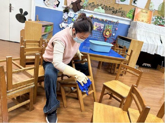 集团各园严格按照统一部署,迅速行动、分工协作,掀起了一场校园环境消杀的热潮。在室内外环境清洁环节,全体教职工化身“环境卫士”,对园内进行拉网式清扫。从活动室的桌椅板凳、玩具器械,到午睡室的床铺、通风设施,再到走廊、楼梯、盥洗室等公共区域的每一处角落,大家都细致擦拭、全面清理,不放过任何一处卫生盲区。户外场地的大型玩具、运动器械也逐一进行冲洗、擦拭和整理,确保幼儿活动空间干净整洁。