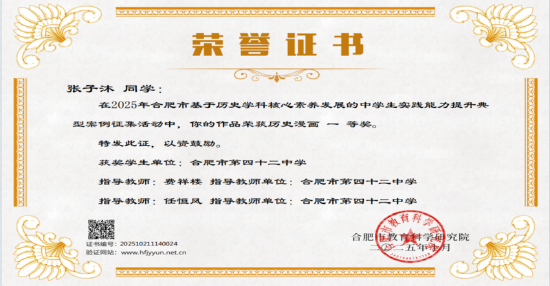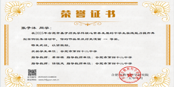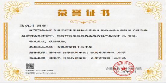 近日,在安徽省及合肥市两级“基于历史学科核心素养发展的中学生实践能力提升典型案例征集与展示”活动中,合肥市第四十二中学学子表现优异,捷报频传,获奖数量与质量均位居合肥市同类学校前列。