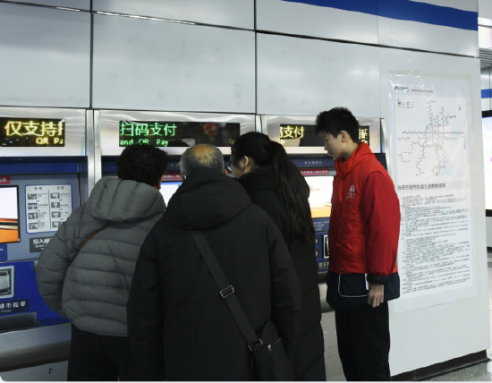 售票机旁,“答疑小能手” 们热情满满、反应敏捷。面对不会操作售票机的乘客,他们俯下身一步步细致讲解,从选择线路、输入站点到扫码支付,耐心得如同对待自家长辈;遇到询问换乘路线的旅客,他们迅速对照线路图,用清晰易懂的语言指明方向,甚至主动带领乘客前往换乘通道。扎实的准备、积极的态度与聪慧的应变,让每一个出行难题都迎刃而解,彰显着青少年的活力与热忱。