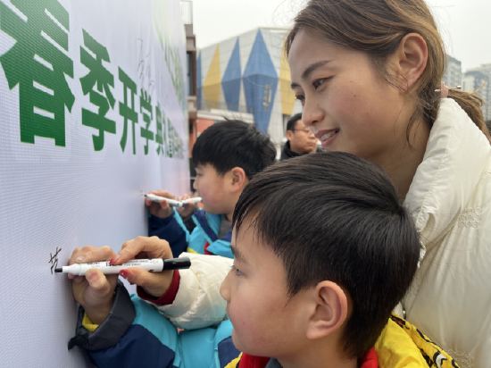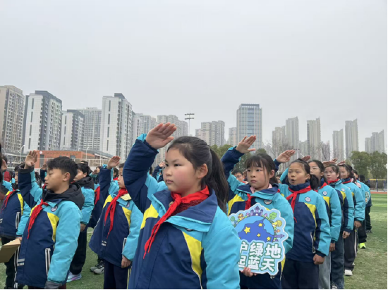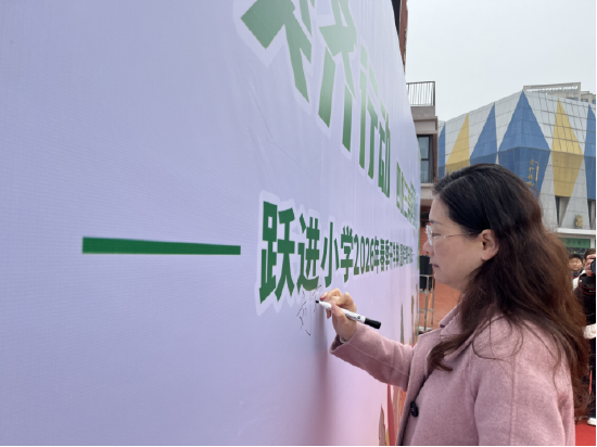 在热烈的氛围中,六(1)中队少先队员代表汪小洋登台,宣读了《跃进小学2026年春季垃圾分类+四好三美化行动倡议书》,号召全体队员“每天分类一小步,文明美化一大步,四好言行记心间,悦进校园共创建”。全体教师、家长代表与队员代表共同在活动横幅上郑重签名,许下新学期践行环保、美化校园、文明言行的庄严承诺。大手牵小手,家校协同育人的合力在此刻凝聚。