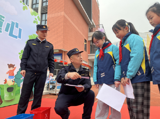 典礼上最受孩子们欢迎的环节当属“环保小课堂”。学校特别邀请了大杨镇城管中心的环保专员团队走进校园。范成刚、孙攀、郑春阳、崔俊杰、曹华年、周松六位专员带着分类垃圾桶模型和各类实物道具登上主席台。他们通过生动形象的讲解,向孩子们演示了可回收物、有害垃圾、厨余垃圾和其他垃圾的正确分类方法。为了让知识入脑入心,专员们还精心设计了“有奖竞答”互动环节。“过期药品是什么垃圾?”“用过的纸巾该扔哪个桶?”问题一出,台下的孩子们纷纷高举小手,争相抢答,现场气氛热烈非凡。答对的同学还获得了环保小礼品,欢声笑语中,垃圾分类的绿色种子悄然播撒在心田。