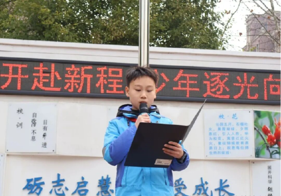 开学典礼在庄严的升国旗仪式中拉开帷幕,全体师生肃立行注目礼,浓厚的爱国情怀在现场升腾。学生代表傅灏宇结合马年精神与学校“自强不息 日有长进”校训,代表全体同学发出倡议,号召大家以骏马般的坚韧活力,坚持阅读、勤于运动、乐于劳动、热爱祖国,脚踏实地争做新时代好少年。