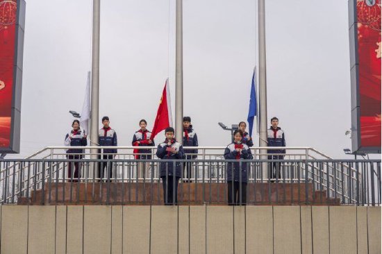 伴随着庄严的出旗曲,少先队旗手迈着整齐的步伐出旗,全体少先队员敬队礼,嘹亮的队歌响彻校园,拉开了本次开学典礼的序幕。五星红旗冉冉升起,雄壮的国歌在会场回荡,全体师生行注目礼,心中的爱国情怀与奋进之志油然而生。