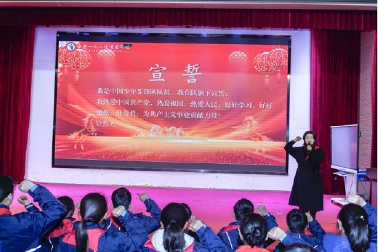 随后,大队辅导员刘靖冉老师和叶菲老师带领全体少先队员庄严宣誓,铮铮誓言彰显着少年们的使命与担当,更凝聚起新学期拼搏奋斗的决心。宣誓完毕,退旗曲缓缓奏响,队会仪式圆满完成。
