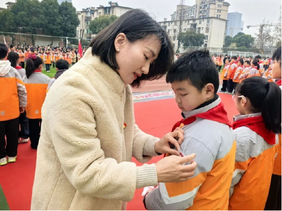 紧接着,学校举行了新一届大队委授标、授旗仪式。副校长仇红伟、陈家敏宣读了新一届大队委及红领巾监督岗成员名单,勉励他们当好“领头马”,发挥榜样示范作用。校长室和学生部共同为新当选的大队委成员授标,崭新的队标在阳光下熠熠生辉,承载着信任,更传递着责任。