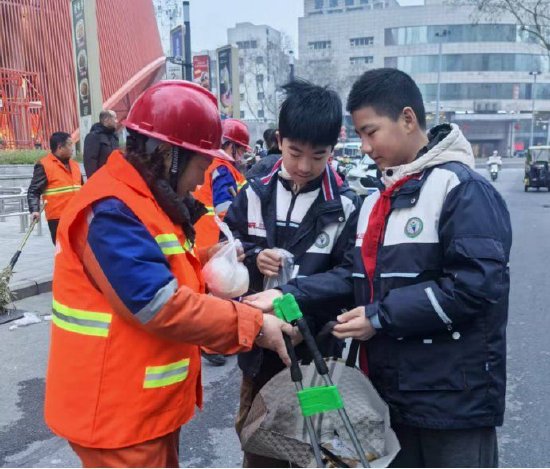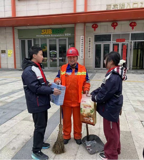 暖心的故事,途中不断上演。看到环卫工阿姨还在弯腰捡拾路面垃圾,几个队员立刻拿起自带的夹子,主动加入清扫队伍;发现一位爷爷的手套磨破了,他们毫不犹豫地摘下自己的新手套给他戴上。原本计划半小时的慰问活动,不知不觉延长到近两小时。红领巾在晨曦中跃动,像一簇簇小火苗,温暖着街头巷尾。