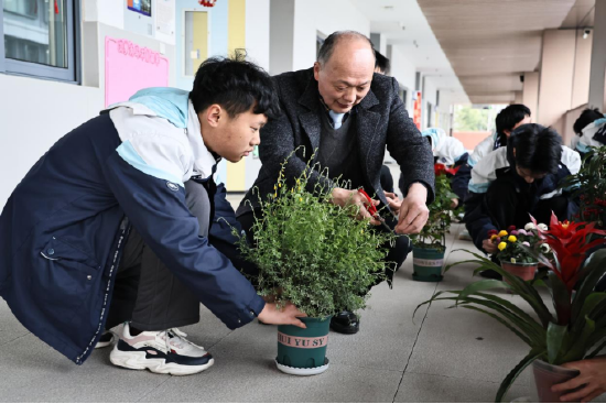 同学们满怀兴奋和感激之情,分组为班级的花卉进行移栽、修剪和浇水,每个小组都进行了合影留念,为绿色校园,生态校园树立了榜样。