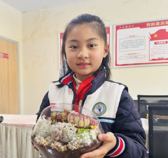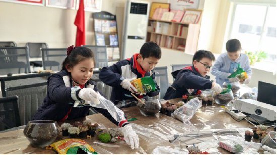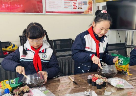 队员们找来小巧的花盆,铺上一层层松软营养土,再小心翼翼种下一株株多肉。他们细心地压实盆土,点缀上几颗小石子,再放上几个小动物摆件,一座专属于他们的微景观就此成型。指尖抚过每一片肥厚的多肉叶片,可以切身感受到生命的鲜活;俯身观察根系在土壤里舒展,便读懂了生长的力量。