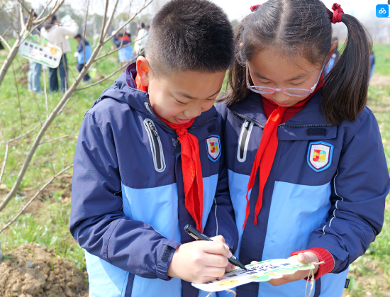 经过大家的共同努力,一排排小树苗整齐挺立,迎风吐绿。队员们亲手为小树苗挂上写有自己名字和心愿的专属名牌,“愿小树苗和我一起长大”“守护绿色,从我做起”……一个个纯真的心愿,承载着队员们对自然的热爱,也镌刻着守护绿色的承诺。