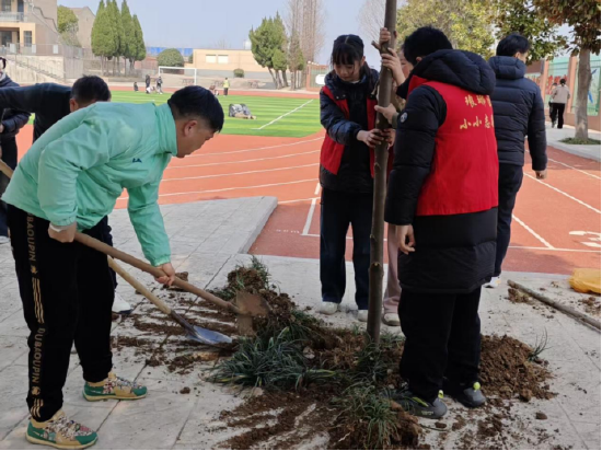 3月12日植树节当天,学校组织五、六年级学生及部分教师在校园内开展植树实践活动。活动中,师生分工协作,老师们挥锹铲土,学生们扶苗浇水,大家干劲十足。经过共同努力,新栽的树苗在春风中昂然挺立,为校园增添了勃勃生机。