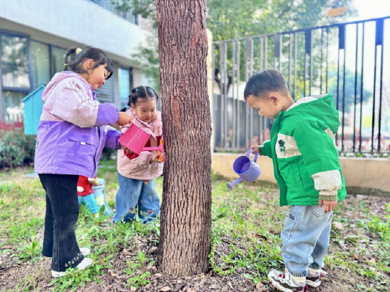 活动中,小班孩子们化身“护绿小园丁”,手持小水壶为社区的树木浇水,给植物松松土,认真又专注。在亲身体验中,孩子们感受劳动的快乐,萌发爱护花草树木的美好情感。中班幼儿还合作测量大树的高度与粗细,在动手操作中探索自然奥秘,提升观察与合作能力。大班幼儿则用行动传递责任。孩子们亲手设计、绘制爱心树牌,在树牌上写下温馨的护绿标语,为校园里的树木挂上专属“身份证”。小小的树牌,承载着孩子们对自然的关爱,也让护绿、爱绿的意识深入人心。