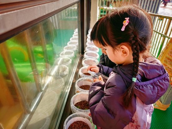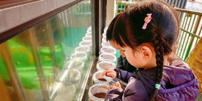 活动中,小班开展“我和小树同成长”活动,孩子们跟随老师一起认识园内植物并给自己种植的小种子浇水、晒太阳。