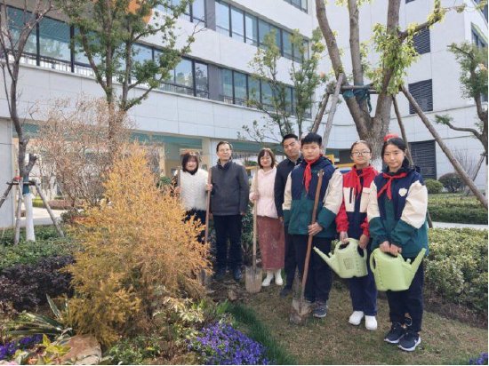 活动现场,合肥一六八玫瑰园学校北校教育集团总书记陈忠好、合肥一六八玫瑰园学校北校副书记、执行校长鲁柏松,七年级组组长朱飞霞老师、班主任童婷婷老师以及七年级学生代表满怀热忱与期许,围绕象征着首届学子使命的映山红树苗共同劳动。