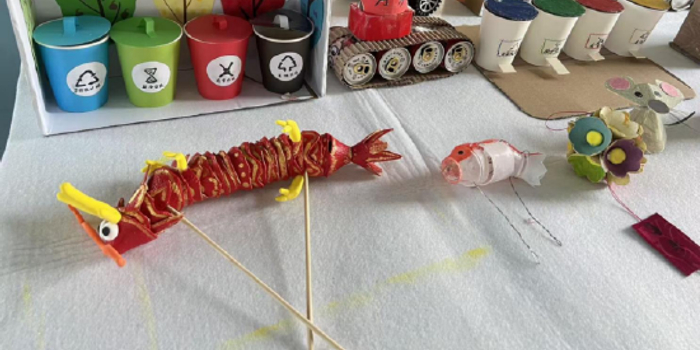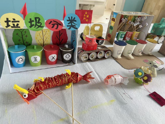 活动前期,教师们向幼儿和家长发起倡议,鼓励大家收集生活中的废旧纸盒、塑料瓶、纸杯、易拉罐等材料,共同参与手工创作。活动现场,孩子们带着自己和家人一起完成的创意作品齐聚一堂:有用纸杯和彩纸制作的垃圾分类站,直观展示了环保知识;用易拉罐和纸板拼接而成的坦克模型,尽显孩子们的军事梦想;还有用红包纸、吸管制作的舞龙和小鱼,洋溢着浓浓的传统年味,每一件作品都凝聚着孩子们的想象力与创造力。