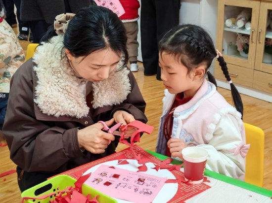 长廊下,“谜跃新春”区域,亲子搭档或低头沉思,或窃窃私语,共同破解灯谜的奥秘。而在室内,“巧手生花”与“趣味拓印”则将传统文化融入游戏。孩子们在家长的协助下,用剪刀剪出精美的窗花,用海绵刷蘸取金墨,在洒金红宣纸上拓出吉祥图案,一幅幅稚嫩却充满童趣的作品不仅带回了家,更印在了心里。