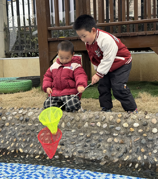 户外水渠边,“年年有鱼”项目将活动推向了高潮。孩子们手持迷你捞网,在家长的贴身守护下,小心翼翼地捕捞水中的红色小鱼。限时两分钟的紧张刺激中,孩子们学会了轻柔与耐心。结束后,大家遵守规则,只带走一条小鱼作为纪念,其余的小鱼被轻轻放回水中,寓意着“共享福气,年年有余”。