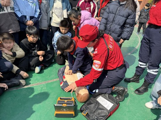 植树活动结束后,为切实增强孩子们的安全防范意识与自护自救能力,肥东阳光救援队队员们为学生带来了一场生动实用的应急演练。队员们通过现场演示、互动教学的方式,向孩子们讲解了心肺复苏、创伤包扎、紧急避险等基础自救互救知识,并邀请学生上台实操体验,让大家在实践中掌握关键的应急技能。