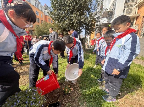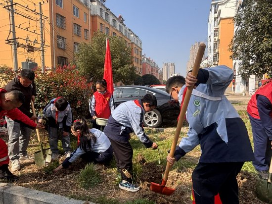 活动现场,师生代表与各单位志愿者们热情高涨、干劲十足。大家分工协作,有的挥锹铲土,有的扶苗填坑,有的提水浇灌,每一道工序都一丝不苟。在老师和共建单位志愿者的耐心指导下,孩子们一步步完成挖坑、放苗、培土、压实、浇水等工序,每一个动作都有模有样。参与活动的同学们纷纷表示,亲手种下树苗的经历让他们真切感受到了劳动的价值,今后会更加珍惜绿色、爱护环境,做生态文明的小小守护者。