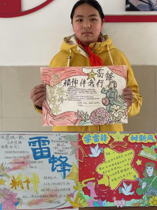 五年级4班周也的手抄报上,“我愿做一颗永不生锈的螺丝钉”格外醒目。“我们画了雷锋在火车上让座、帮助旅客的场景。画着画着,我明白了,身边的小事也能温暖人心。”周也分享道。五年级3班李晓萌捧着自己的作品,眼中满是自豪。她的手抄报上写着“学习雷锋好榜样”七个大字。字体刚劲有力,仿佛在向观者传递着革命精神的坚定与力量。