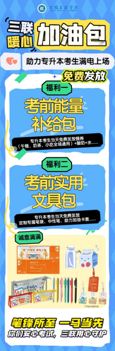 关注专升本考生接“福”了!安徽三联学院为您准备暖心加油包,免费发放能量补给包、文具包等福利,助力考生考试无忧。