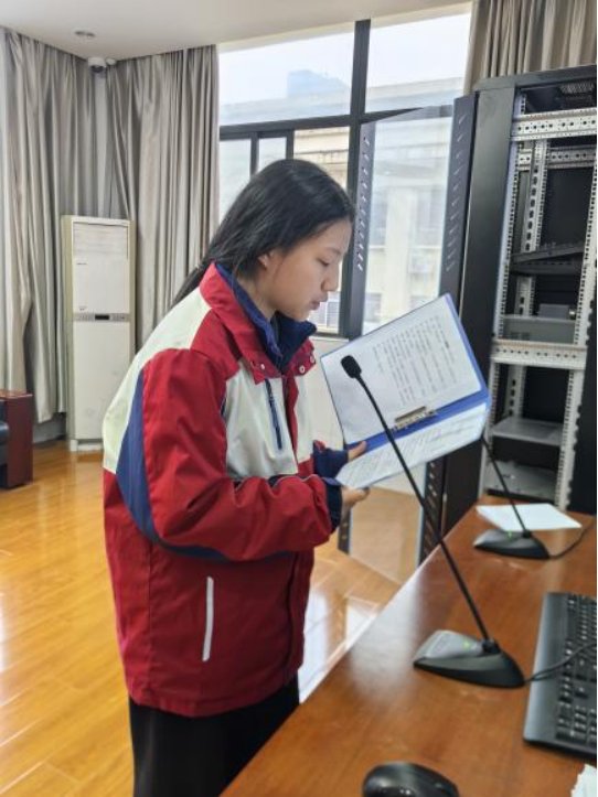 惜水于微,共护蔚蓝。程品卓同学采取对比论证的方式,既讲述着水在生活中的重要作用,还阐述了校园内浪费水资源的不和谐画面,告诉同学们:水,是地球赋予万物最珍贵的馈赠。“今天的我们,是青春的守护者,更是未来的建设者。让我们以青春之名,惜每一滴水,护一方蔚蓝。用点滴行动,为地球注入生机,为未来留存希望”。程品卓同学青葱而坚定的声音,赢得了师生们的热烈掌声。