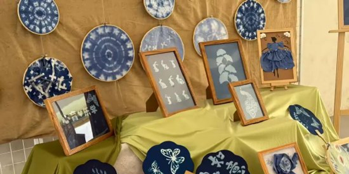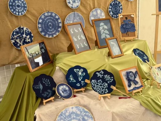 扎染艺术展区以传统蓝染为基底,绷框、团扇、布艺造型等作品肌理独特,蓝白交融间尽显非遗工艺之美,传递“心育乐学”的积极理念。