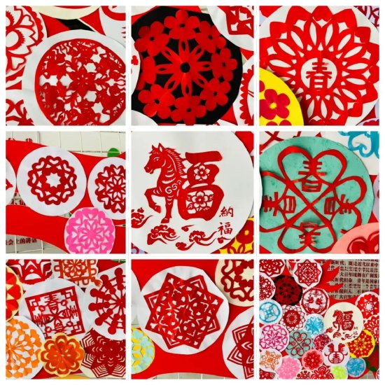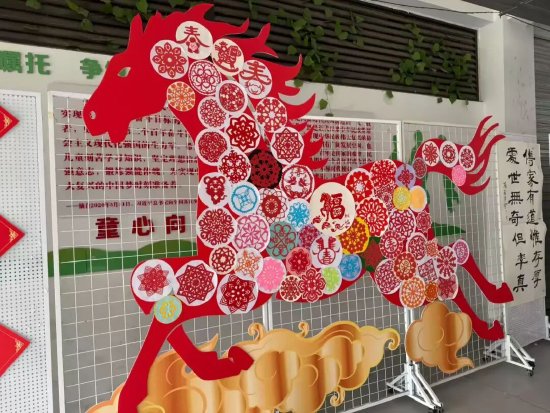 剪纸艺术展区以“马到成功”为核心,大型骏马剪纸装置由数十片学生原创窗花拼贴而成,融入“春”“福”“美”等吉祥纹样,传统团花、如意纹与童趣图案交相辉映,让非遗剪纸在校园焕发新生;