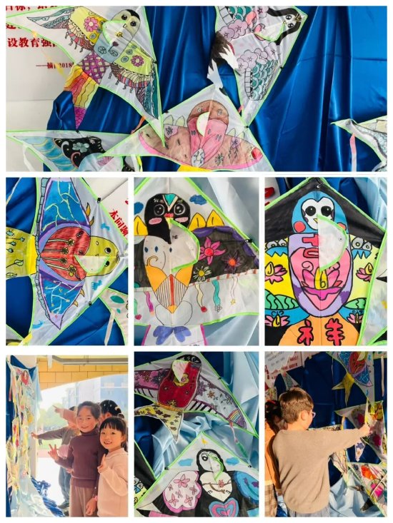 风筝艺术展区色彩斑斓,飞鸟、小熊、国风花鸟等手绘风筝迎风展姿,承载着孩子们“乘风而上、逐梦远方”的美好心愿