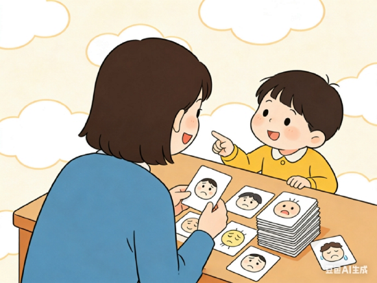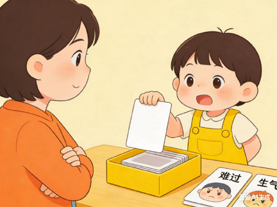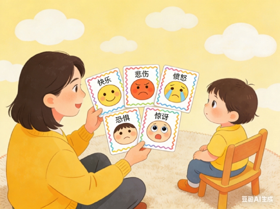 2、家长表演孩子猜:家长抽取情绪卡片,仅用表情和动作进行表演,由孩子观察并说出情绪名称。猜对后给予拥抱表扬。此环节旨在让孩子先“看懂”。
