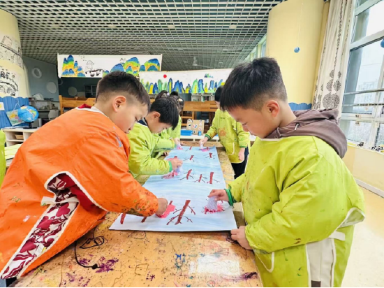 活动中,教师引导幼儿观察迎春花、桃树、紫藤花的形态与色彩,激发幼儿探索自然的兴趣。孩子们运用手指、水果网等,以点彩方式蘸取颜料,认真勾勒、细心点染,在创作中锻炼动手能力,体验艺术创作的乐趣。