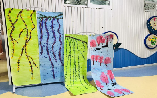 幼儿完成的作品被精心布置成班级艺术展,孩子们在展示与欣赏中获得成就感,涵养“乐表达”“乐审美”的核心素养。大家在创作中大胆交流、自信表达,充分展现“乐探究、乐动手、乐交往、乐表达、乐审美”的精神风貌。