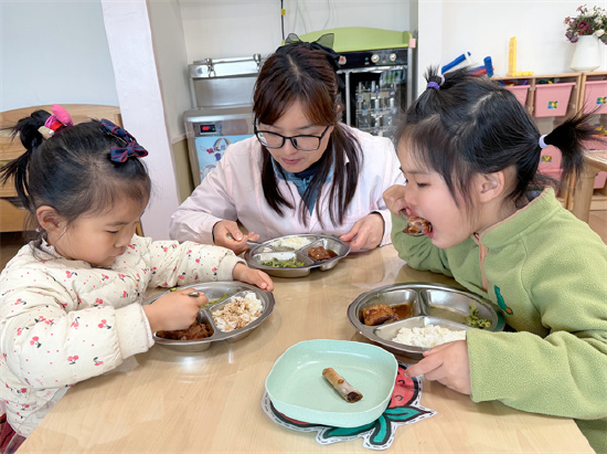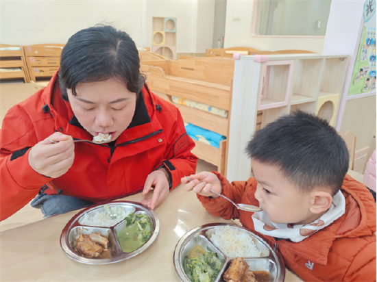 午餐时分,试餐人员副园长陈茜、保教主任陈岚、后勤负责人宋园园老师、食品安全管理员蒋志静老师及行政值班人员深入班级,全程细致查看幼儿用餐情况,认真核对当日餐食与营养食谱、食材是否一致,仔细检查菜品分量、温度及餐具洁净度,严把食品安全与营养关。进餐过程中,试餐人员耐心询问孩子们“今天的菜好吃吗?”“喜欢吃什么呀?”,引导幼儿均衡饮食、珍惜粮食,用温暖的笑容和亲切的话语陪伴幼儿愉快进餐。认真倾听幼儿的用餐感受,及时与食堂工作人员沟通反馈,结合幼儿口味偏好与成长营养需求,不断优化膳食搭配与烹饪细节,以责任守护舌尖安全,用爱心陪伴健康成长,让每一餐都温暖、安心、有营养。