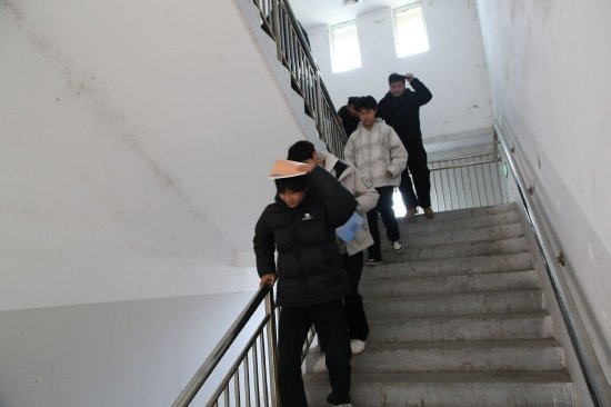 演练模拟上课期间突发有感地震,随着警报声响起,全系各班立即启动地震避险科目。任课教师快速指挥学生就近蹲伏在课桌下方,双手护头、蜷缩身体,规范做好自我防护,整个避险过程沉着有序。待疏散信号发出,师生迅速转入震后疏散环节,大家弯腰低姿、双手护头,沿着预设安全通道有序撤离,楼梯转角、实训楼出口均有系部教师值守引导,全程杜绝拥挤、推搡、掉队现象。