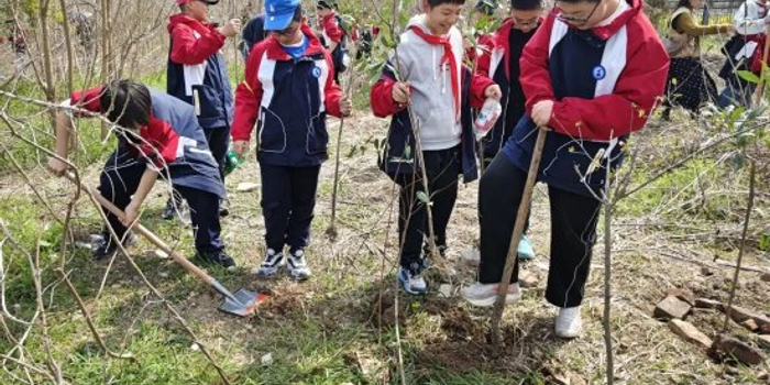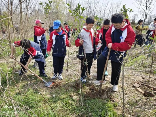 下午1时许,身着红校服的小志愿者们精神饱满地抵达植树现场。在园林基地工作人员的指导下,大家迅速分工协作,挥锹铲土、扶苗填坑、提水浇灌……每个环节都认真细致、一丝不苟。尽管汗水浸湿了衣背,泥土沾满了鞋袜,但同学们热情不减,现场一派热火朝天的劳动景象。经过近两小时的辛勤劳作,数十株新栽的树苗迎风挺立,在春日暖阳下焕发出勃勃生机。