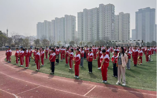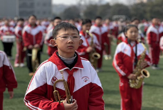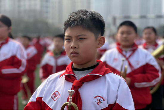 号声嘹亮,鼓点铿锵。伴随着指挥旗的有力挥动,鼓号队队员们昂首挺立,乐器拿得端正,动作整齐划一。嘹亮的小号声划破长空,铿锵的鼓点如春雷般激荡人心,为升旗仪式拉开了庄严的序幕。