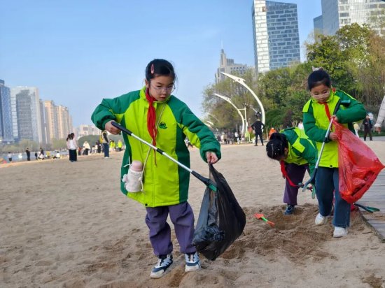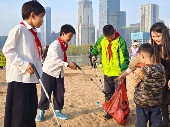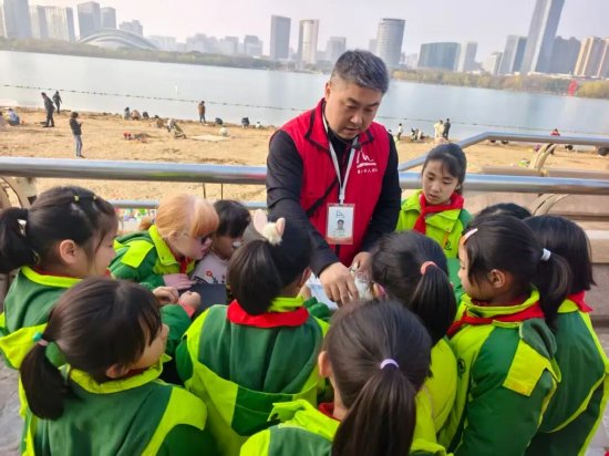 科普环节结束后,“环保小河长”们立即“上岗履职”。他们戴着统一的标识,沿湖开展护水实践:俯身清理岸线隐匿的烟头和塑料垃圾,向过往市民分发节水护水宣传资料,并用稚嫩却坚定的声音宣讲河湖保护知识。