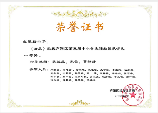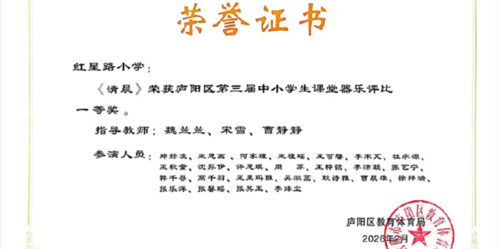 此次荣获区级一等奖,是对学校美育工作和课堂乐器教学的充分肯定。未来,合肥市红星路小学将继续深耕艺术教育,积极开展课堂乐器教学,让音乐浸润校园,让艺术点亮童年,助力每一位红星少年在美育的滋养下全面发展、快乐成长!(魏兰兰)