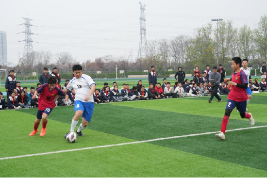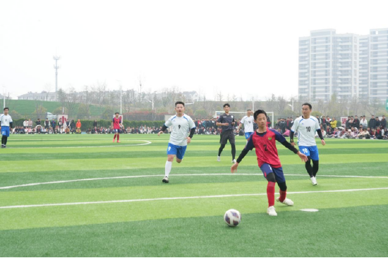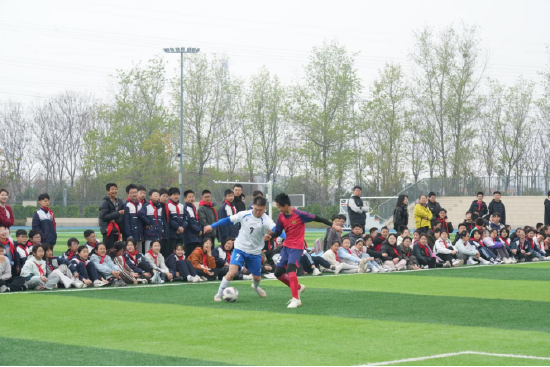 揭幕赛上,校长董永辉与教师代表组队,与学生队员同场竞技,瞬间点燃了全场的热情。随着赛事推进,场边观赛的同学们不时发出阵阵欢呼,“校长进球了”“没想到校长踢球这么有实力”的喊声此起彼伏。拉拉队员们有的急得直跺脚,有的激动得跳起来鼓掌。阳光洒在奔跑的身影上,汗水与笑声交织,师生之间的距离在追逐与拼抢中悄然消融。