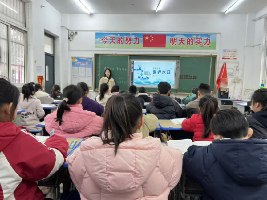 主题班会,入脑入心。 活动期间,学校举行节约用水主题升旗仪式,通过国旗下的讲话教育学生从自己做起,从现在做起。人人争做节水小卫士。各班级纷纷召开“节约用水,从我做起”主题班会。班主任们利用多媒体课件、科普视频及生动的案例,向学生们讲解了“世界水日”和“中国水周”的由来及重要意义,并围绕今年“水与性别”这一国际主题,引导学生探讨不同性别在水资源管理与保护中扮演的角色,培养平等协作的环保意识。同时,结合“国家水网 世纪画卷”的国内主题,老师们深入浅出地介绍了国家水网建设的宏伟蓝图,让学生们了解到水利工程对国家发展和人民生活的重要性。班会上,同学们踊跃发言,分享家庭节水小妙招,并纷纷表示要用实际行动守护珍贵的水资源。