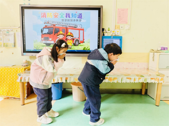 大班幼儿化身“安全小达人”,开展更具实践性的安全教育活动。针对火灾逃生场景,老师们详细讲解火灾疏散的注意事项,带领孩子们模拟弯腰捂鼻、有序撤离的简单疏散动作,孩子们认真学习、规范操作,掌握了基础的火灾逃生技能。