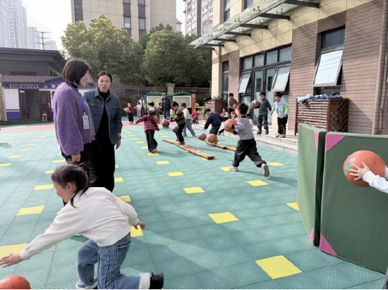 张晓梅重点查看了户外场地利用、活动组织形式及幼儿参与状态。园内篮球体能大循环活动开展得如火如荼,孩子们在教师的科学引导下,有序进行拍球、运球、传球等趣味体能训练,个个精神饱满、活力满满,在沉浸式运动中锻炼了肢体协调性与团队协作能力,展现出积极向上的精神风貌,督学对该特色体能活动的组织成效给予了充分肯定。针对户外活动场地规划,张督学细致指出,园区游戏区、运动区、沙水池等功能分区划分不够明显,需进一步优化调整。