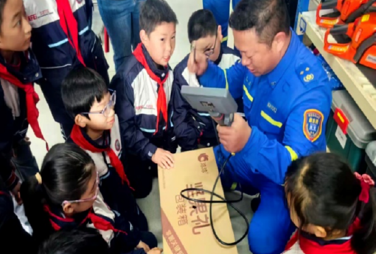 在装备库里,队员们的好奇心被彻底点燃。救援队的叔叔们耐心讲解各类救援设备:从头顶的专业救援头盔,到精密的生命探测仪;从水上救援的充气艇,到山地搜救的绳索装备。