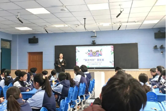 第二节课是王金晶老师在八5班执教的心理课《“高光时刻”摄影展》。王老师以别出心裁的“摄影展”为情境载体,引导学生发现并记录生活中的积极体验。课程围绕“高光时刻灵感库”展开,通过“我爱”“我享”“我行”“我乐”四个维度,帮助学生从兴趣、分享、行动与快乐中发掘自身闪光点。课堂互动热烈,学生们在小组讨论与自我分享中逐步建立起积极的自我认知。王老师以温暖而专业的引导,鼓励每位同学看见自己的独特价值,找到属于自己的“高光亮点”。整节课氛围轻松而富有感染力,展现了心理健康教育润物无声的独特魅力。